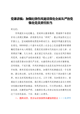 党课讲稿:加强纪律作风建设深化全面从严治党强化党员责任担当.docx