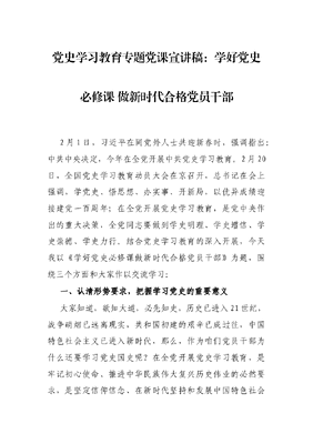 党史学习教育专题党课宣讲稿:学好党史必修课 做新时代合格党员干部.docx