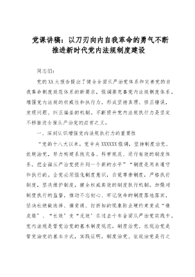 党课讲稿:以刀刃向内自我革命的勇气 不断推进新时代党内法规制度建设.docx