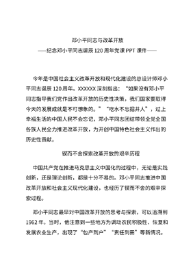 红色大气纪念邓小平同志诞辰120周年党课讲稿:邓小平同志与改革开放.docx