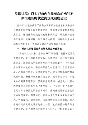 党课讲稿:以刀刃向内自我革命的勇气不断推进新时代党内法规制度建设.docx