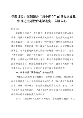 党课讲稿:深刻领会“两个确立”的重大意义 扎实推进主题教育走深走实、入脑入心.docx