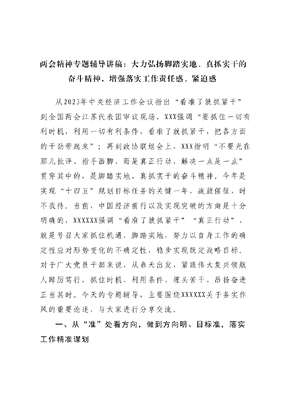 两会精神专题辅导讲稿:大力弘扬脚踏实地、真抓实干的奋斗精神,增强落实工作责任感、紧迫感.docx