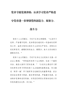 党章专题党课讲稿:认真学习党章严格遵守党章进一步增强党的创造力、凝聚力、战斗力.docx