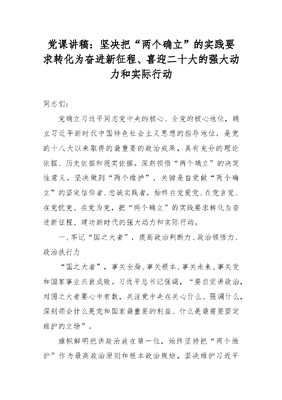 党课讲稿:坚决把“两个确立”的实践要求转化为奋进新征程、喜迎二十大的强大动力和实际行动.doc
