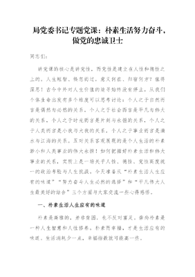 局党委书记专题党课:朴素生活努力奋斗,做党的忠诚卫士.docx