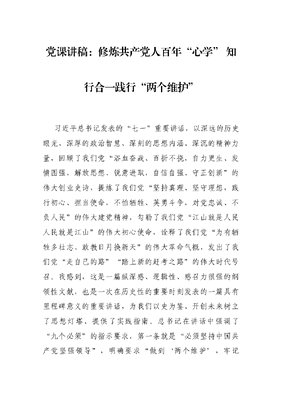 党课讲稿:修炼共产党人百年“心学” 知行合一践行“两个维护”.docx