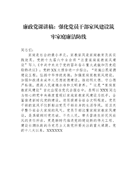 廉政党课讲稿:强化党员干部家风建设+筑牢家庭廉洁防线.docx