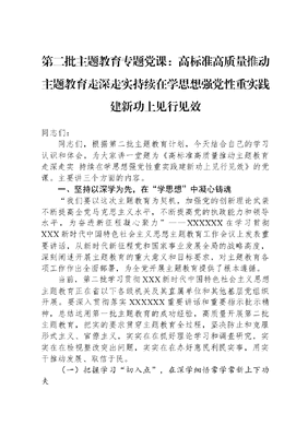 第二批主题教育专题党课:高标准高质量推动主题教育走深走实,持续在学思想强党性重实践建新功上见行见效.docx