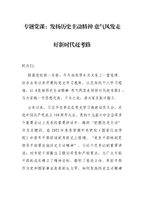 2022年专题党课:发扬历史主动精神意气风发走好新时代赶考路.docx