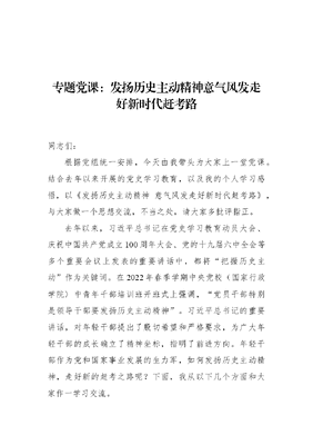专题党课:发扬历史主动精神 意气风发走好新时代赶考路.docx
