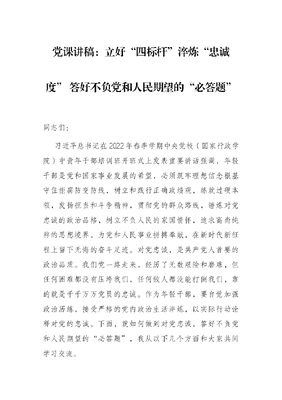 党课讲稿:立好“四标杆”淬炼“忠诚度” 答好不负党和人民期望的“必答题”.docx