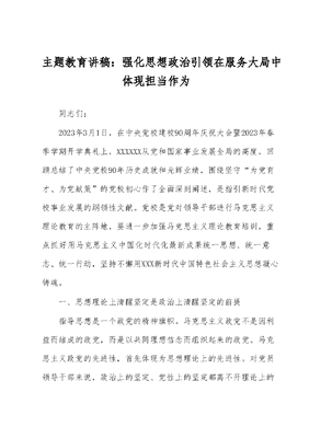 主题教育讲稿:强化思想政治引领 在服务大局中体现担当作为.docx