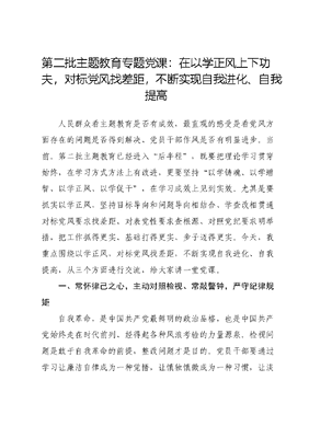 第二批主题教育专题党课:在以学正风上下功夫,对标党风找差距,不断实现自我进化、自我提高.docx