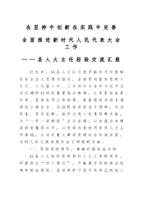 在坚持中创新在实践中完善全面推进新时代人民代表大会工作县人大主任经验交流汇报.doc