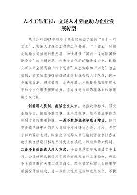 人才工作汇报:立足人才强企助力企业发展转型.docx