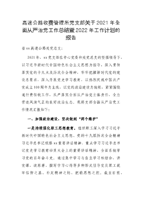 高速公路收费管理所党支部关于2021年全面从严治党工作总结暨2022年工作计划的报告.docx
