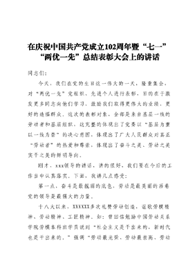 在庆祝中国共产党成立102周年暨“七一”“两优一先”总结表彰大会上的讲话.docx