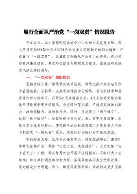 XX同志履行全面从严治党“一岗双责”情况报告.docx