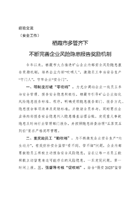 (经验交流)栖霞市:多管齐下,不断完善企业风险隐患报告奖励机制.doc