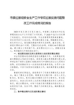 市委巡察组安全生产工作专项巡察反馈问题整改工作完成情况的报告.docx