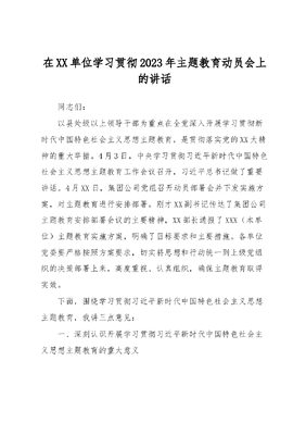 在XX单位学习贯彻2023年主题教育动员会上的讲话.docx