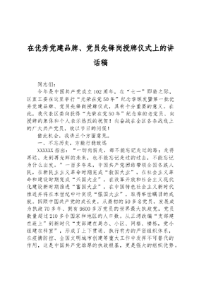 在优秀党建品牌、党员先锋岗授牌仪式上的讲话稿.docx