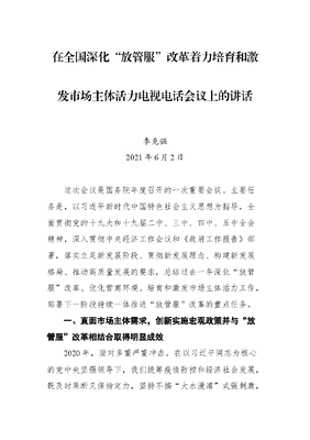 在全国深化“放管服”改革着力培育和激发市场主体活力电视电话会议上的讲话.docx