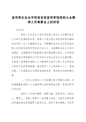 宣传部长在全市网信系统宣传贯彻党的大会精神工作部署会上的讲话.docx
