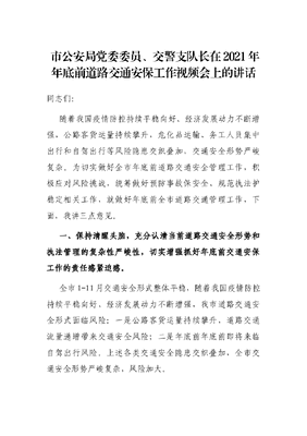 市公安局党委委员、交警支队长在2021年年底前道路交通安保工作视频会上的讲话.docx