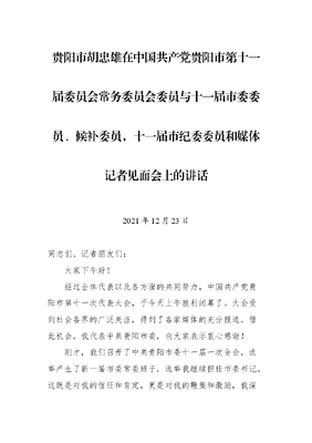 贵阳市胡忠雄在中国共产党贵阳市第十一届委员会常务委员会委员与十一届市委委员、候补委员,十一届市纪委委员和媒体记者见面会上的讲话.docx