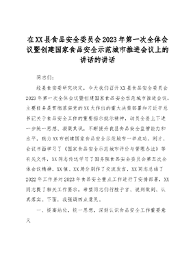 在XX县食品安全委员会2023年第一次全体会议暨创建国家食品安全示范城市推进会议上的讲话的讲话.docx