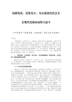高质发展、后发先至,为全面建设社会主义现代化强市而努力奋斗——在全市“高质发展、后发先至”动员大会上的讲话.docx