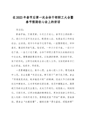 在2023年春节后第一次全体干部职工大会暨春节假期收心会上的讲话.docx