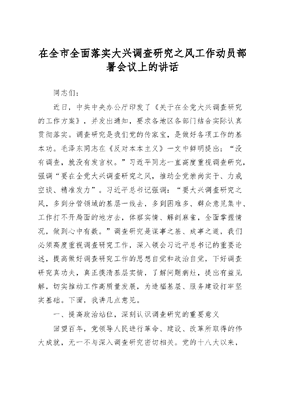 在全市全面落实大兴调查研究之风工作动员部署会议上的讲话.docx