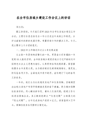 在全市住房城乡建设工作会议上的讲话.docx