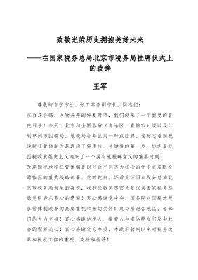 王军:致敬光荣历史 拥抱美好未来(在国家税务总局北京市税务局挂牌仪式上的致辞).doc