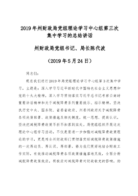2019年州财政局党组理论学习中心组第三次集中学习的总结讲话.docx