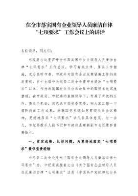 在全市落实国有企业领导人员廉洁自律“七项要求”工作会议上的讲话.docx