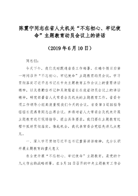 陈震宁同志在省人大机关“不忘初心、牢记使命”主题教育动员会议上的讲话.docx