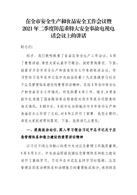 在全市安全生产和食品安全工作会议暨2021年二季度防范重特大安全事故电视电话会议上的讲话.docx