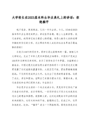 大学校长在2023届本科生毕业典礼上的讲话:拒绝躺平.docx