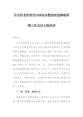 在全区老旧住宅小区综合整治改造物业管理工作会议上的讲话.docx