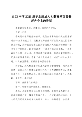 在XX中学2023届毕业班成人礼暨高考百日誓师大会上的讲话.docx