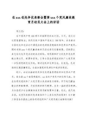 在xxx创先争优表彰会暨第xxx个党风廉政教育月动员大会上的讲话.docx