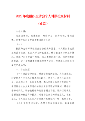 (6篇)2022年度(对照在政治信仰、党员意识、理论学习、能力本领、作用发挥、纪律作风方面的问题和不足)组织生活会个人对照检查材料.docx