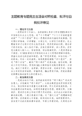 主题教育专题民主生活会对照检查、批评与自我批评意见.docx