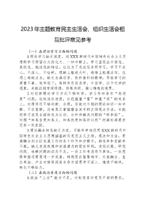 2023年主题教育民主生活会、组织生活会相互批评意见参考.docx
