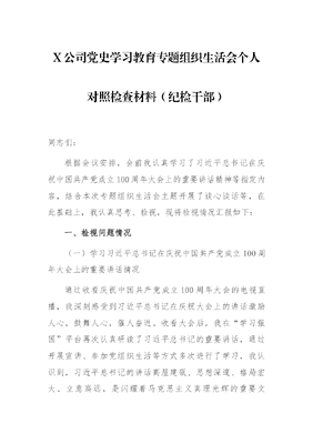 X公司党史学习教育专题组织生活会个人对照检查材料(纪检干部).docx