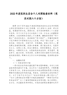 2022年度组织生活会个人对照检查材料(党员对照六个方面).docx